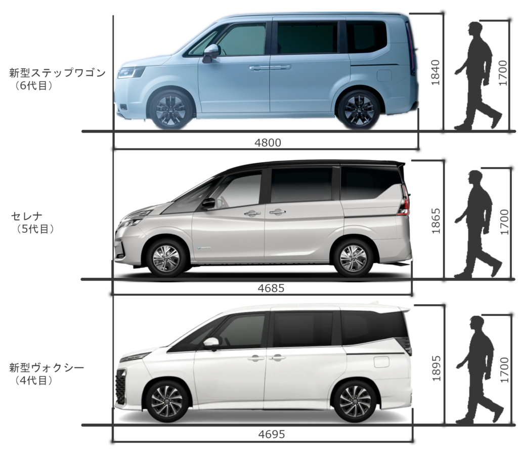 - 全長 ステップワゴン 4800mm、ヴォクシー 4695mm、セレナ 4685mm