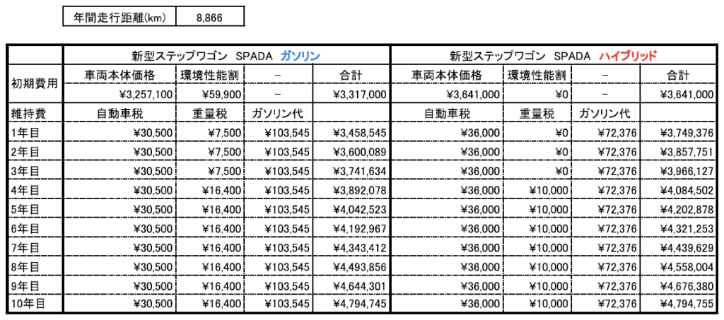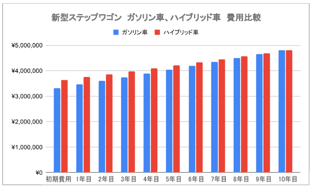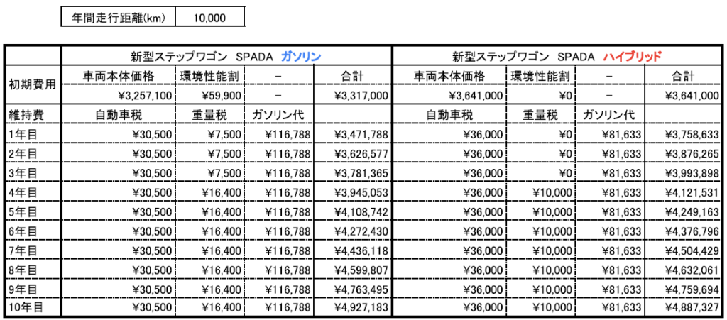 そこで、ガソリン車とハイブリッド車の費用について、初期費用にあたる車両本体価格と取得時の税金、維持費にあたる自動車税、重量税とガソリン代について年間ごとの合計金額で比較してみました。