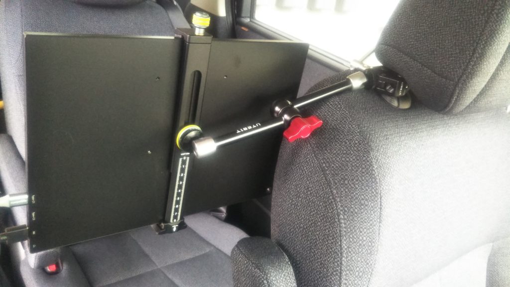 ヘッドレストへの取付は、マジックアームとiPadホルダーを使用してます。クランプ側をヘッドレストの金具へ取付して、反対側のホットシューにはiPadホルダーを取付して、ホルダーにモバイルモニターを挟み込んで固定します。